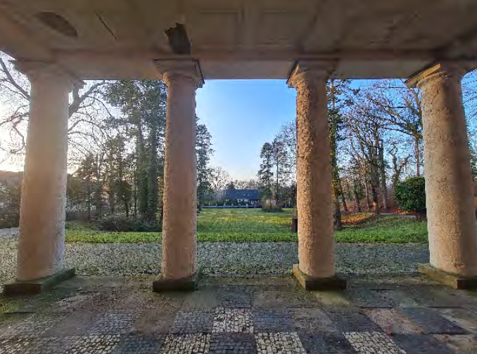 Der nach Osten ausgerichtete Park im englischen Stil verfügte über eine große Vielfalt üppiger Rosen und einen historischen Baumbestand. Wenige Meter entfernt befand sich das Stall- und Wohngebäude der Angestellten, das von Schondorf im gleichen Stil entworfen wurde. Während des ersten Weltkrieges ließ der Großherzog den Park zu Ackerflächen umgestalten, um die hungernde Bevölkerung zu unterstützen. Siehe auch Wikipedia: https://de.wikipedia.org/wiki/Großherzogliches_Palais_Neustrelitz